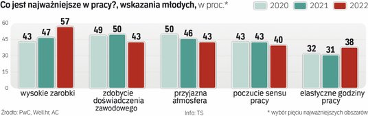 Już nie przyjazna atmosfera ani możliwość zdobycia doświadczenia, lecz wysokie zarobki znalazły się na pierwszym miejscu listy czynników ważnych dla zaczynających pracę młodych ludzi – wynika z tegorocznej edycji raportu „Młodzi Polacy na rynku pracy”, wspólnego projektu firm PwC, Well.hr i Absolwent Consulting, który „Rzeczpospolita” opisuje jako pierwsza. W poprzednich edycjach raportu wysokie zarobki zajmowały w tym zestawieniu drugie–trzecie miejsce, a w tym roku okazały się kluczowe dla niemal 57 proc. młodych (o 10 pkt proc. więcej niż rok wcześniej). Badano 2 tysiące Polaków do 27. roku życia.
