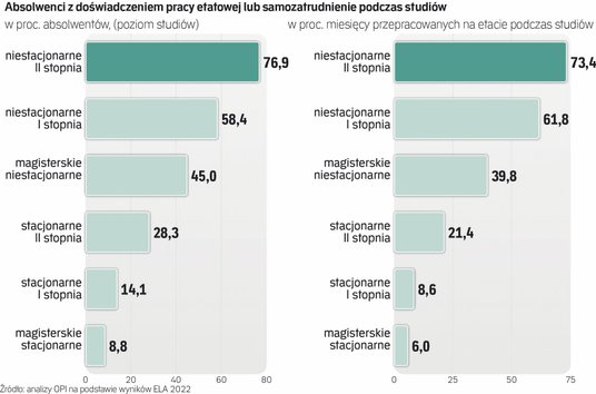 Niemal 60 proc. absolwentów studiów niestacjonarnych I stopnia ma już za sobą doświadczenie pracy na etacie lub samozatrudnienia, a jeśli chodzi o studia II stopnia – aż 77 proc. – pokazuje analiza przygotowana przez Ośrodek Przetwarzania Informacji – Państwowy Instytut Badawczy (OPI-PIB) na podstawie tegorocznych wyników monitoringu Ekonomicznych Losów Absolwentów, czyli ELA. Wprawdzie znacznie niższe są te wskaźniki dla absolwentów studiów dziennych (odpowiednio 14 i 28 proc.), ale nie zmienia to faktu, że coraz więcej studentów łączy naukę z pracą, zdobywając doświadczenie zawodowe już w trakcie studiów – podkreślają eksperci OPI-PIB.